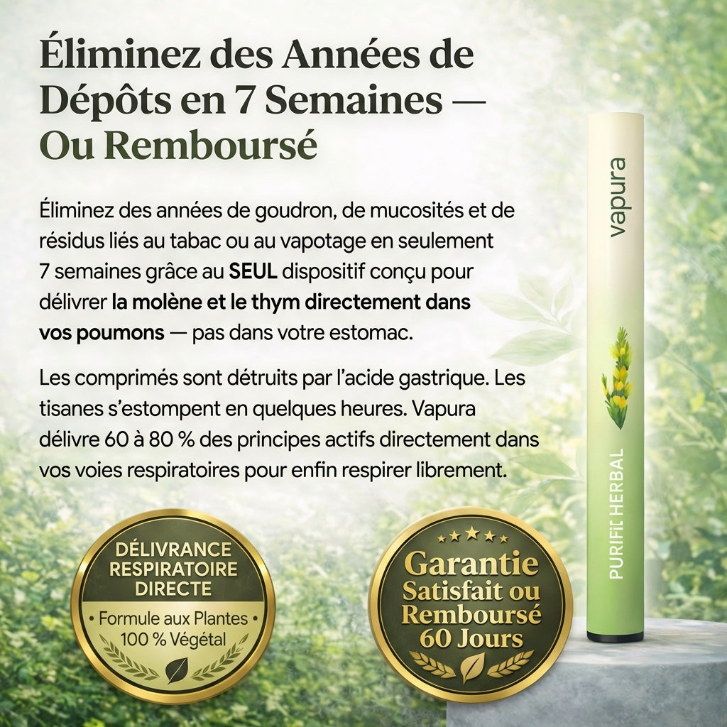 J'avais une congestion thoracique depuis DES ANNÉES. J'ai tout essayé — pilules, tisanes, inhalations, humidificateurs. Rien n'y faisait. Le diffuseur Vapura délivre les plantes directement dans le système respiratoire. Au bout de 10 jours, j'ai commencé à expulser un mucus épais. Maintenant respirer est devenu naturel. Mon pneumologue était stupéfait. Ça a tout changé.